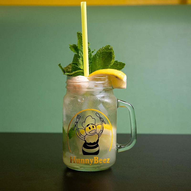 Lychee Syrup, muddled mint and lemon, lemonade & sparkling water. topped with lychee topping, lychee fruit, and garnished with a lemon.